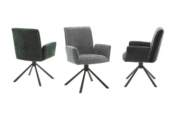 Der 4-Fuß-Stuhl BOULDER mit gebürstetem Edelstahlgestell und Chenille-Bezug ist drehbar, 180° neigbar und belastbar bis 120 kg.